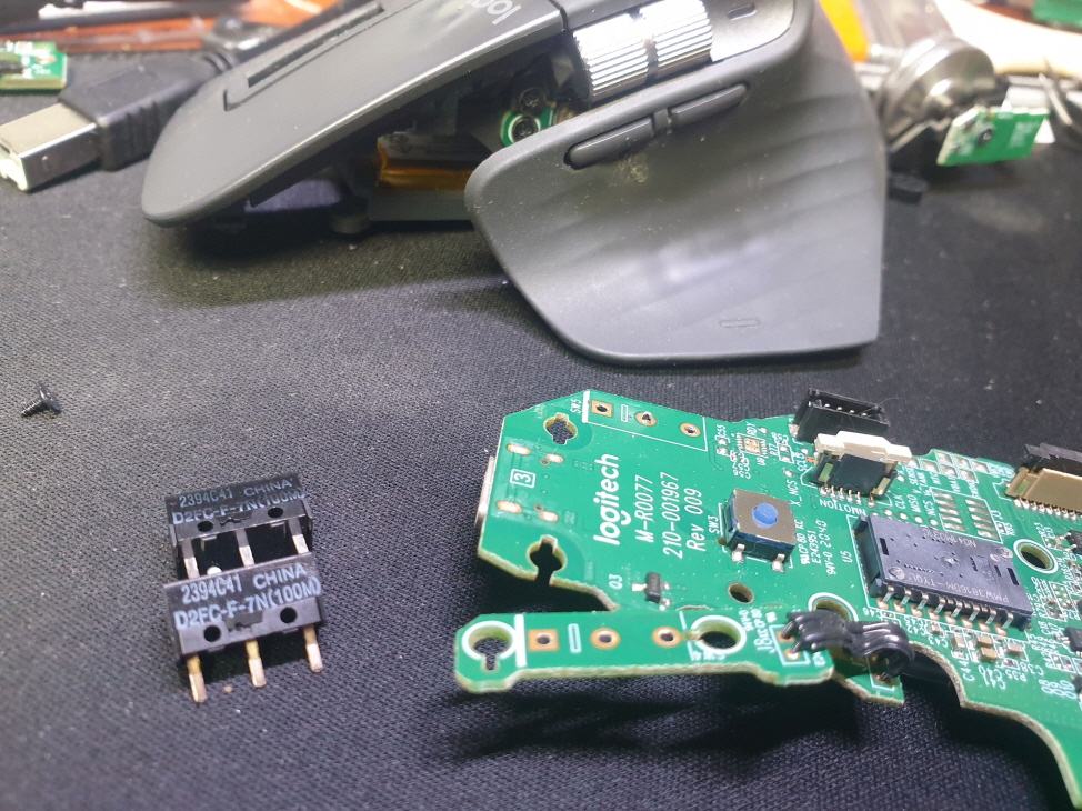 왼쪽버튼 더블클릭 증상인 버튼내 스위치불량으로 새 스위치 D2FC-F-7N(100M) 좌우교체 수리 진행합니다.
