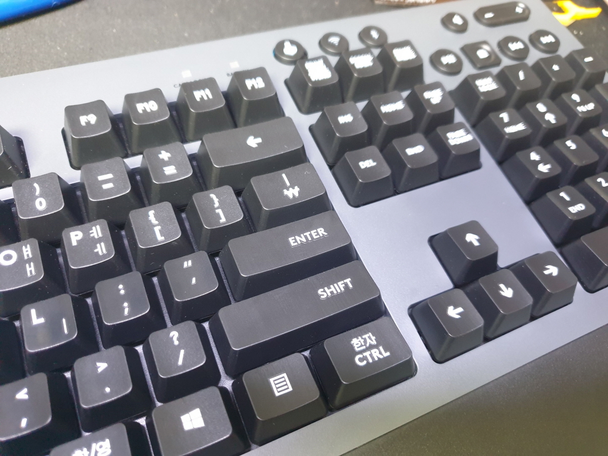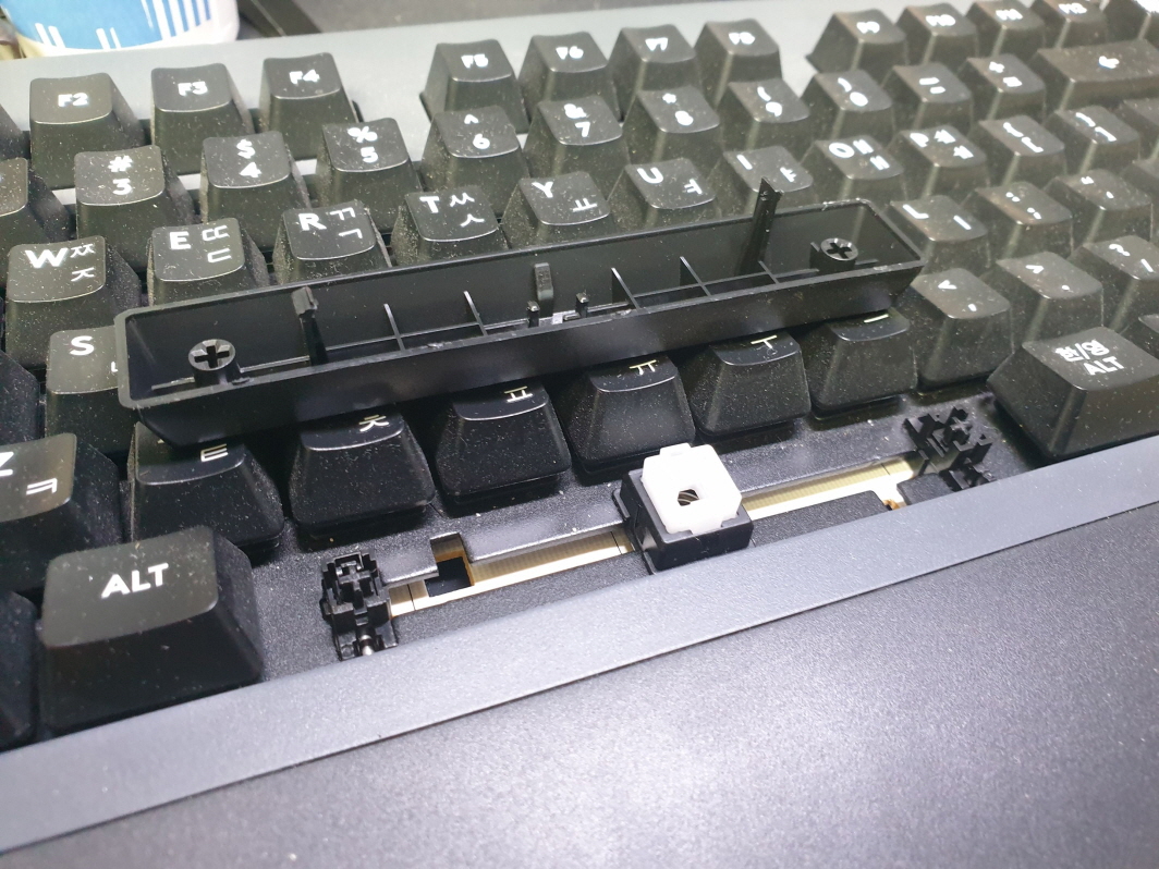 스페이스바 스테빌라이져파손불량으로 수리 진행합니다. 추가로 윈도우 및 메뉴키가 안눌리는 경우는 오른쪽 상단 조이스틱아이콘의 버튼이 윈도우/메뉴 키 방지버튼입니다. 왼쪽/오른쪽 ON/OFF 위치하시면됩니다.