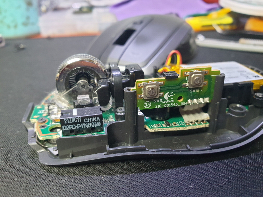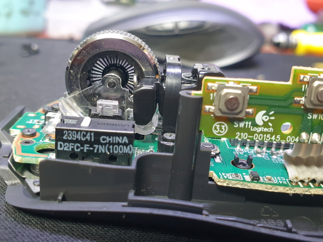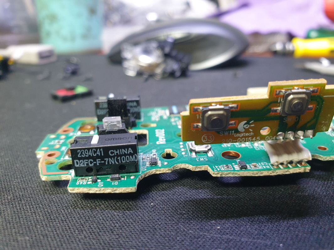 왼쪽버튼 씹히는 문제인 버튼내 스위치불량으로 새 스위치 D2FC-F-7N(100M) 좌우교체 수리 진행합니다.