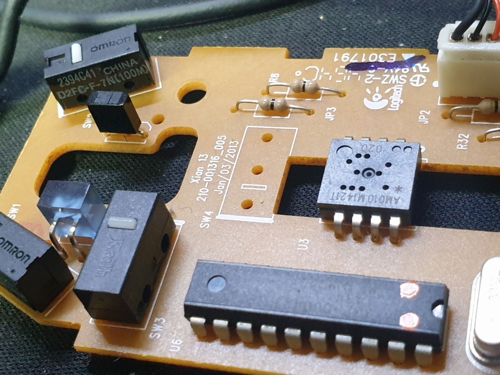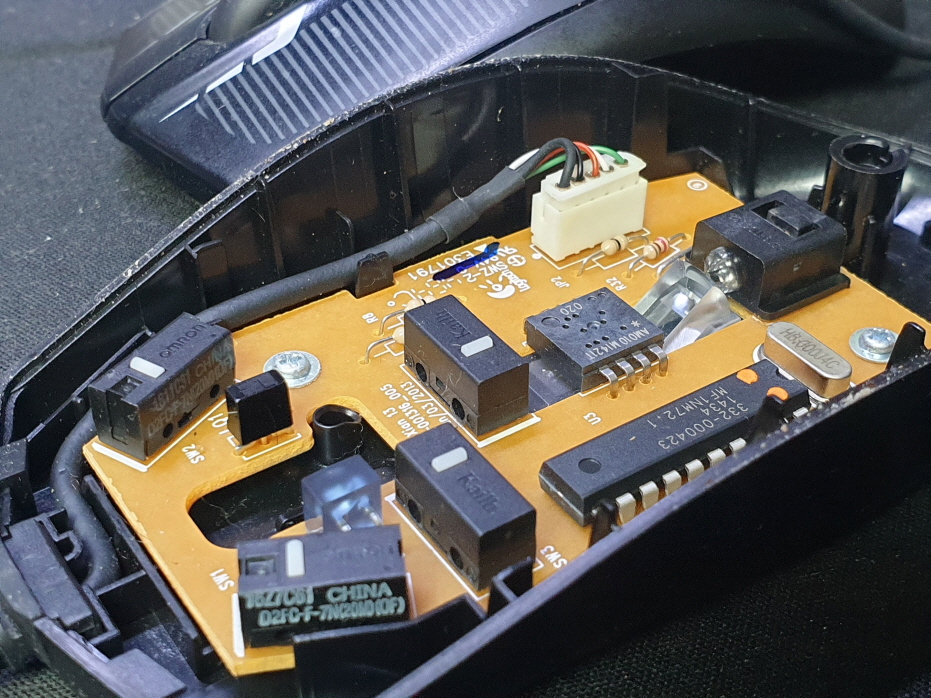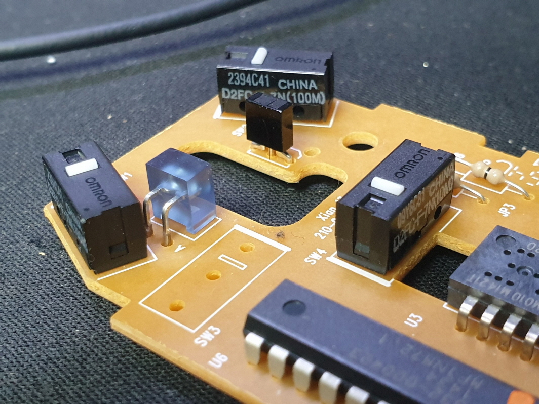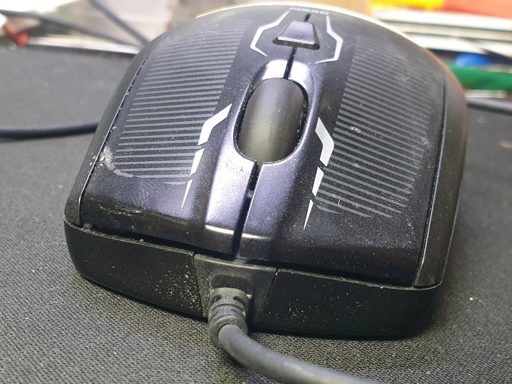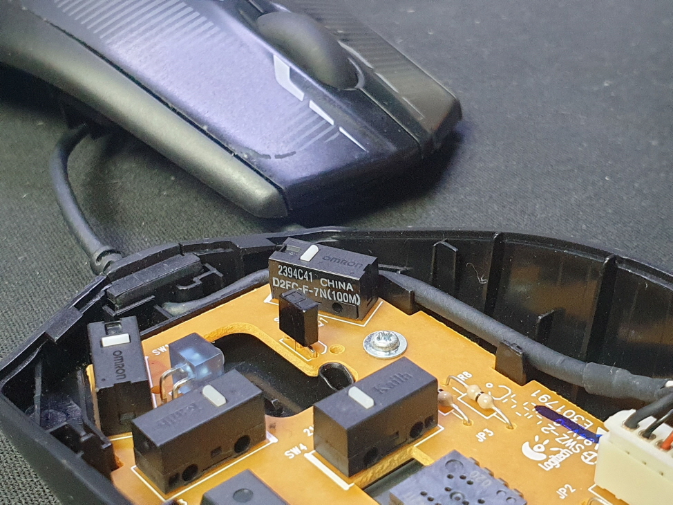 왼쪽버튼 씹히는 증상인 버튼내 스위치불량으로 새 스위치 D2FC-F-7N(100M) 좌우교체 수리 진행합니다. 추가로 휠버튼(스위치)도 함께 교체진행합니다.
