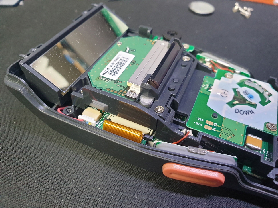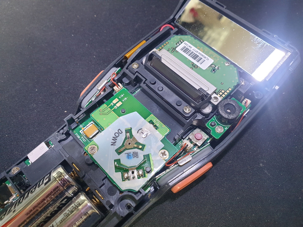 측면 양쪽 주황색버튼으로 바코드스캔시 레이져가 나오지 않고 버튼을 꾹눌러야 레이져가 나오는 문제인 양쪽 버튼 불량으로 수리 진행합니다.