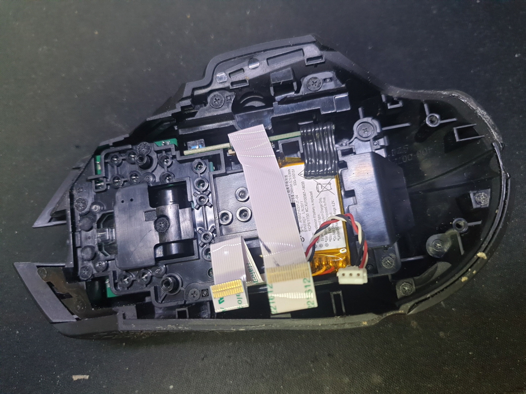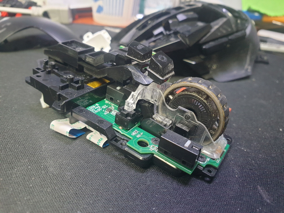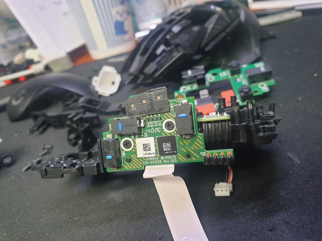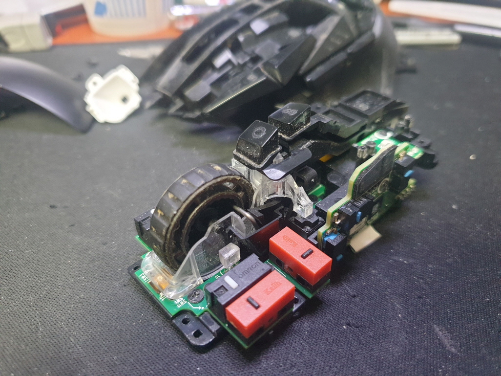버튼내 스위치불량으로 새 스위치 D2FC-F-7N(100M) 좌우교체 수리 진행합니다. 추가로 측면 앞으로가기 더블클릭 뒤로가기 잘안눌리는 문제로 앞뒤스위치도 교체합니다.