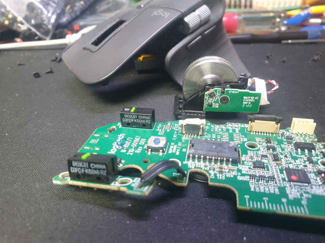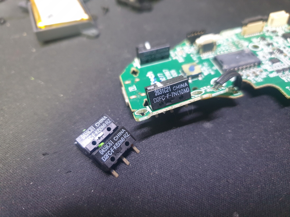 왼쪽 버튼 씹힘 증상인 버튼내 스위치불량으로 고객님 요청으로 새 스위치 D2FC-F-K(50M)-RZ 좌우교체 수리 진행합니다.