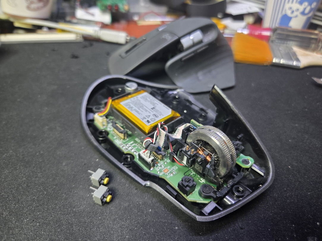 왼쪽버튼 안눌리는 문제인 버튼내 스위치불량으로 새 스위치 카일 저소음 옐로우스위치 좌우교체 수리 진행합니다.