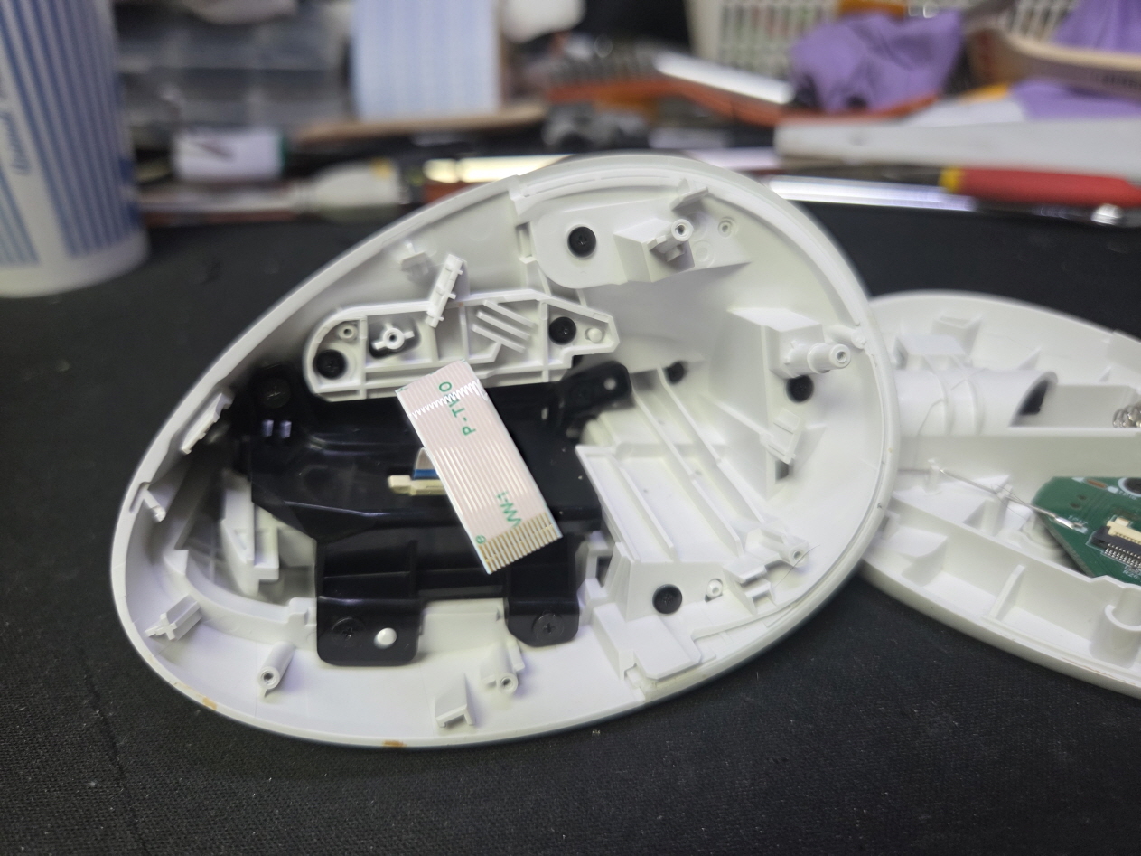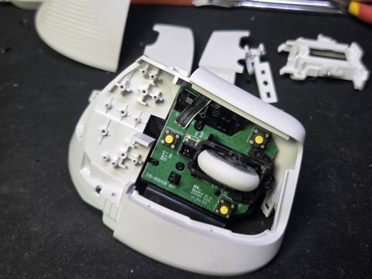 왼쪽버튼 잘안눌리거나 씹히는 증상인 버튼내 스위치불량으로 새 스위치 카일 저소음옐로우스위치 좌우교체 수리 진행합니다.